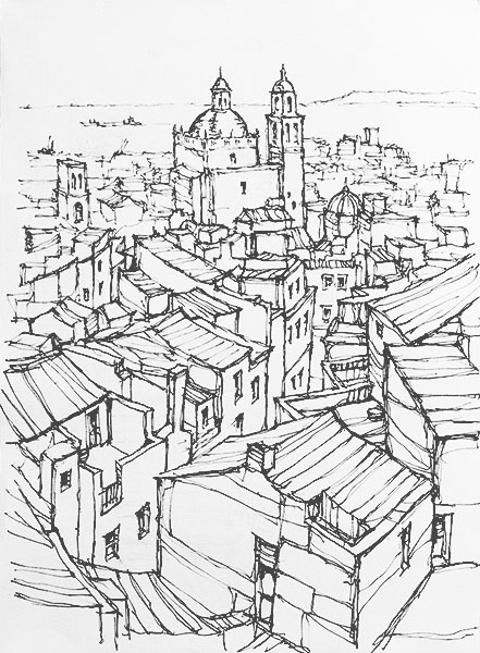 On location he would produce sketches which he would paint from later. He uses a range of colours throughout his work, often favouring Indian inks for his oil paintings. Working on etched gesso has given the paintings an extra depth, enhancing the dimensional perspective and segmenting out the composition, pleasantly leading the viewers eye around each section.